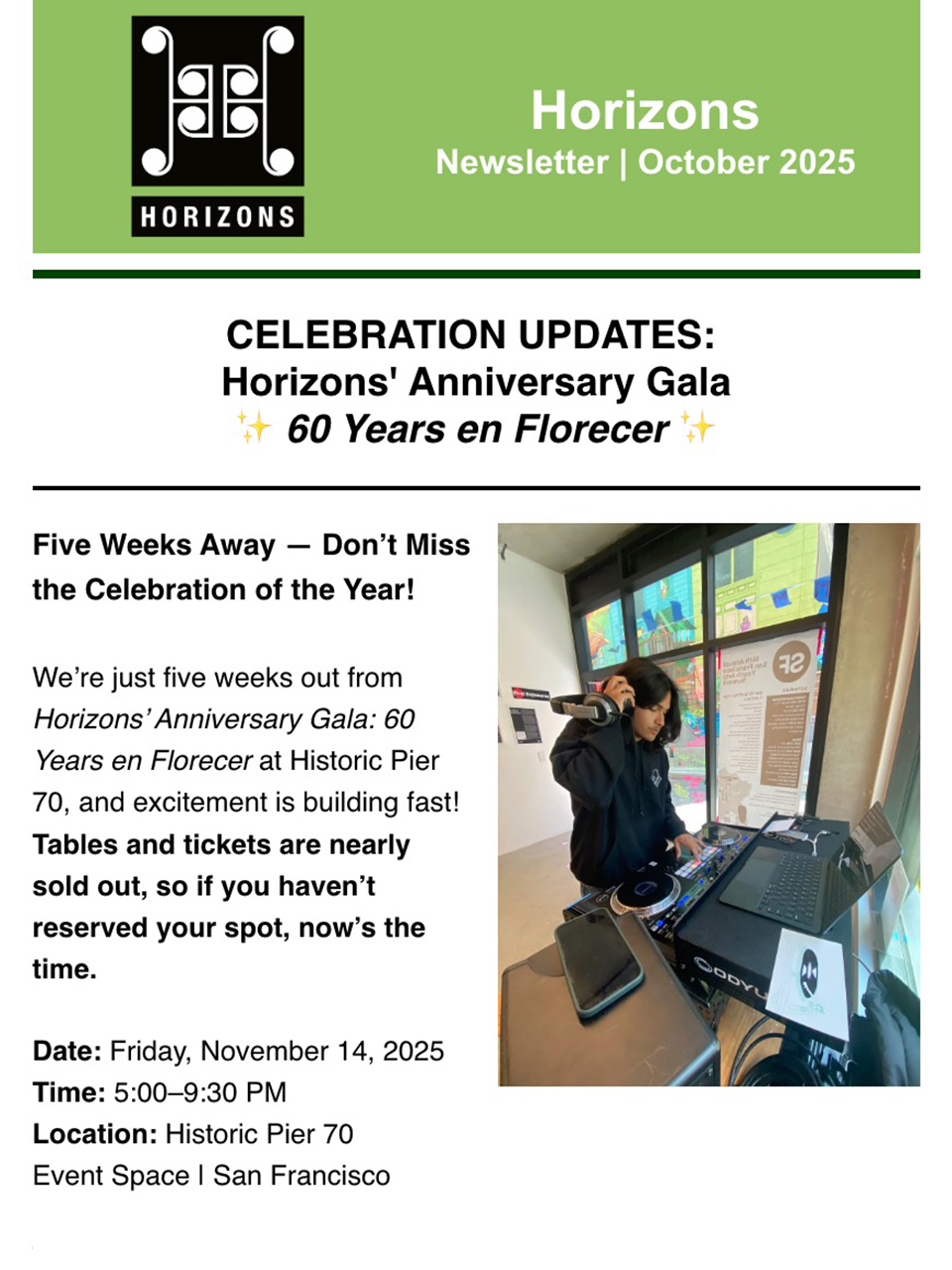 The celebration of the year is almost here! Join us on Friday, November 14, 2025, from 5:00-9:30 PM at Historic Pier 70 for 60 Years en Florecer. Tables and tickets are nearly sold out. This is your final chance to be part of this milestone evening of community, music, and joy. - Support Our Silent Auction!
